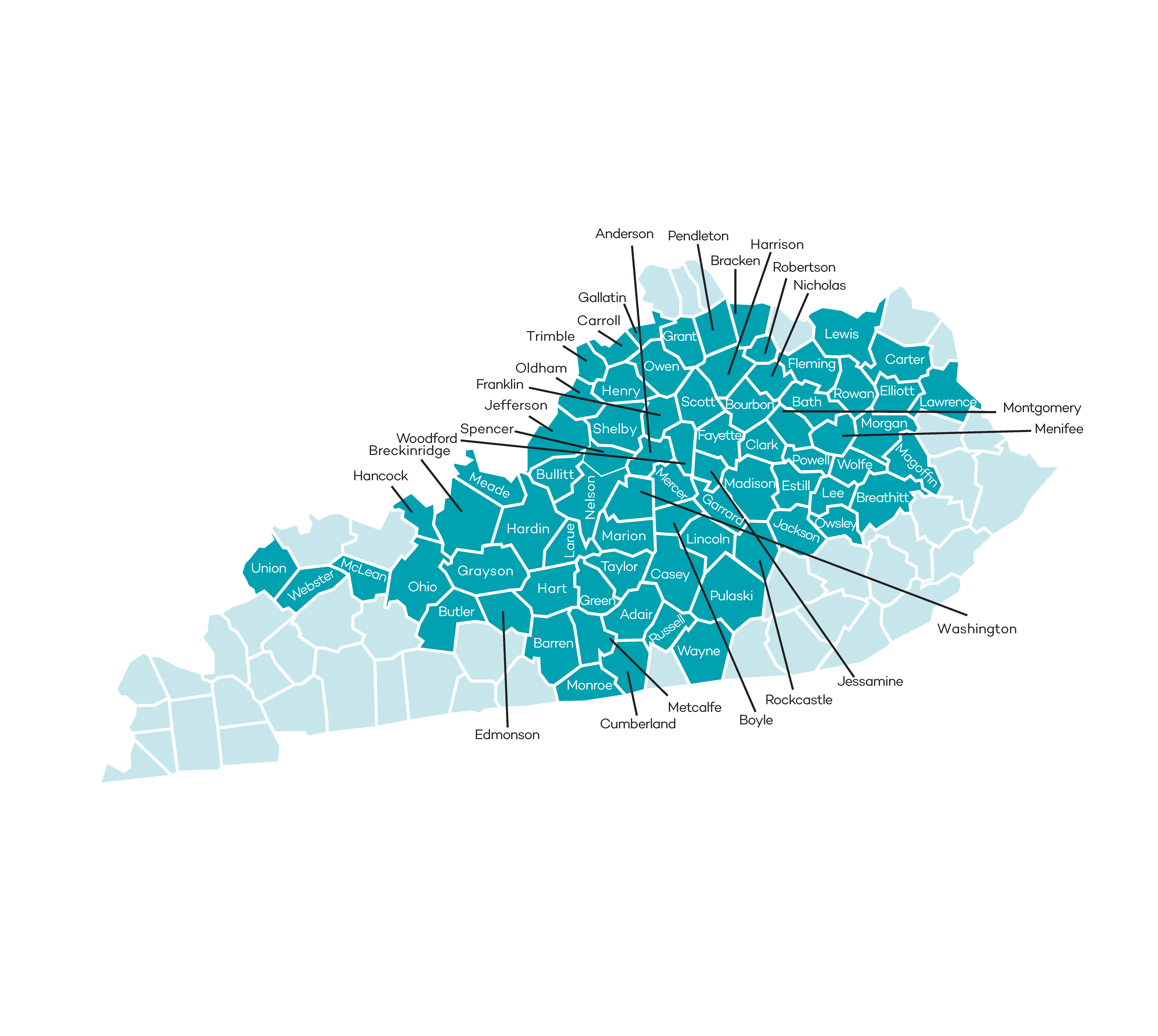 Condados de Adair, Anderson, Barren, Bath, Bourbon, Boyle, Bracken, Breathitt, Breckinridge, Bullitt, Butler, Carroll, Carter, Casey, Clark, Cumberland, Edmonson, Elliott, Estill, Fayette, Fleming, Franklin, Gallatin, Garrard, Grant, Grayson, Green, Hancock, Hardin, Harrison, Hart, Henry, Jackson, Jefferson, Jessamine, Larue, Lawrence, Lee, Lewis, Lincoln, Madison, Magoffin, Marion, McLean, Meade, Menifee, Mercer, Metcalfe, Monroe, Montgomery, Morgan, Nelson, Nicholas, Ohio, Oldham, Owen, Owsley, Pendleton, Powell, Pulaski, Robertson, Rockcastle, Rowan, Russell, Scott, Shelby, Spencer, Taylor, Trimble, Union, Washington, Wayne, Webster, Wolfe, y Woodford