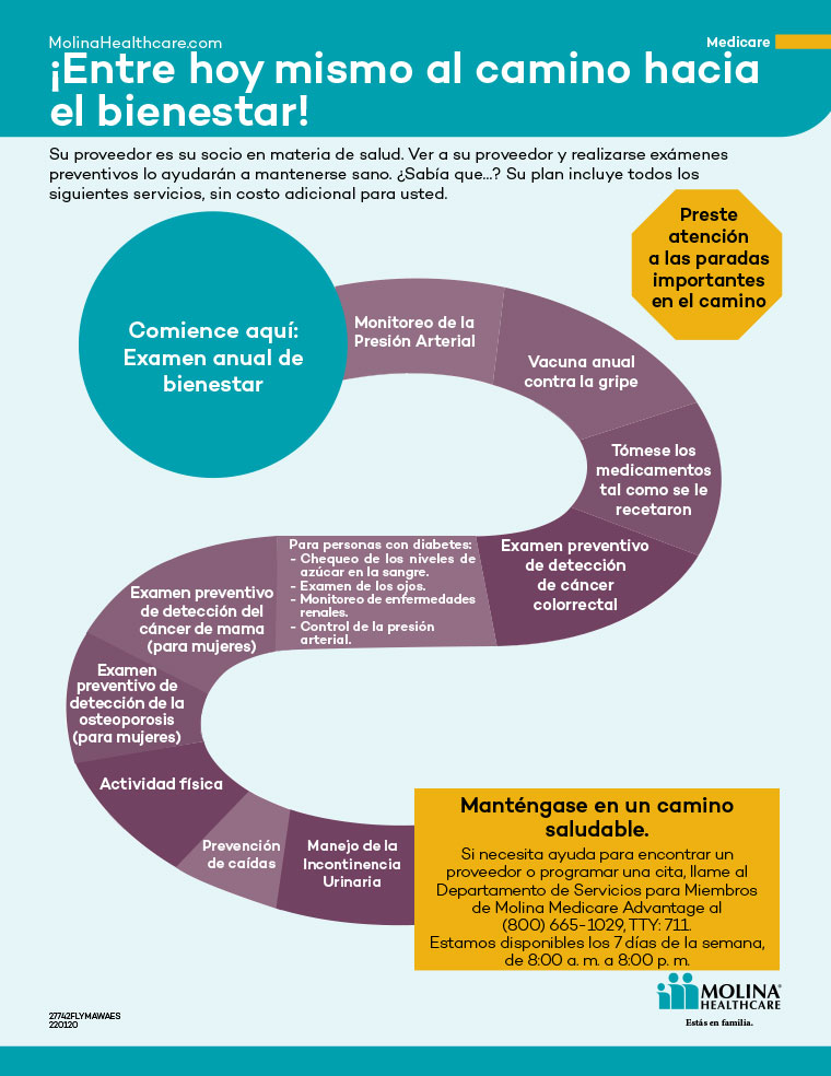 Monitoreo de la presión arterial Vacuna anual contra la gripe Tómese los medicamentos tal como se le recetaron Examen preventivo de detección del cáncer colorrectal Para personas con diabetes: Examen preventivo de detección del cáncer de mama Examen preventivo de detección de la osteoporosis Actividad física Prevención de caídas Controle la incontinencia urinaria Comience aquí: Examen annual de bienestar